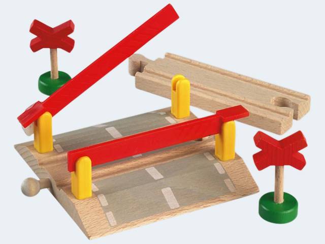 Wo Schienen und Straße aufeinander treffen. Wenn Schienen und Straße sich kreuzen wird es spannend. Senke die Schranken und schau zu, wie der Zug vorbeifährt.