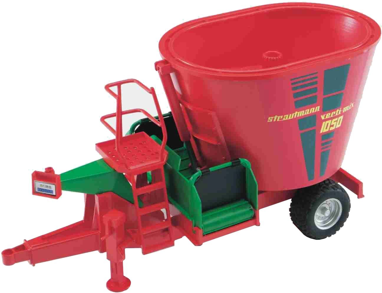 Das Messerwerk (aus Kunststoff) im Mischbehälter des Strautmann Futtermischwagens Verti-Mix 1050 ist drehbar und der Auslassschieber am Behälter kann geöffnet werden. Das Querförderband ist voll funktionsfähig und die Digitalanzeige schwenkbar. Ein ausziehbarer Stützfuss bietet sicheren Halt und Profilreifen runden das Bild ab. Zur Spielergänzung kann der Strautmann Futtermischwagen Verti-Mix 1050 mit allen Traktoren der Profi-Serie kombiniert werden (nicht im Lieferumfang enthalten).