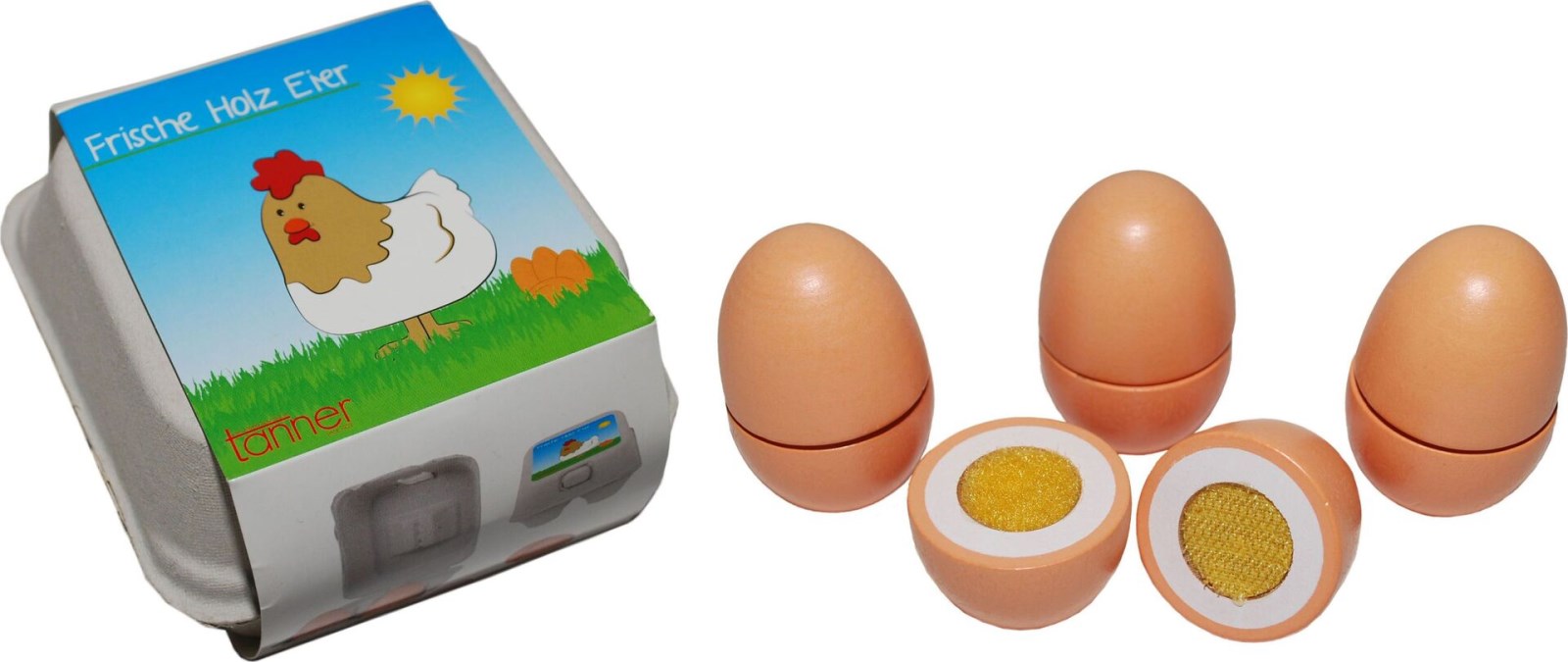 Eier zum Schneiden aus Holz. Mit Klettverschlussverbindugen. Gefüllt mit 4 Eiern aus Holz. Ab 3 Jahren.