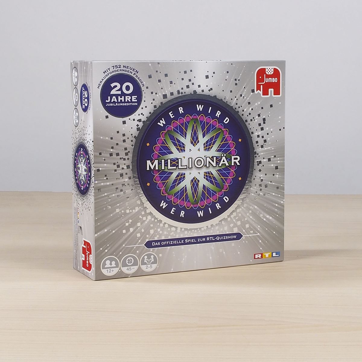 Mit dieser Sonderausgabe zum 20 - jährigen Jubiläum holen Sie die klassische Quizshow „Wer wird Millionär?” in Ihr Wohnzimmer. Diese Edition enthält 752 neue Fragen, die eine Menge Herausforderungen und Spielspaß bieten. Und so funktioniert es: 1. Die Spieler übernehmen der Reihe nach eine Runde die Rolle des Quizmasters. Der Quizmaster stellt allen Kandidaten gleichzeitig die Frage auf der Fragenkarten. 2. Die Spieler beantworten die Frage mit ihrer Stimmkarte. 3. Der Quizmaster fängt mit einer Frage mit niedrigem Gewinn (50€) an und stellt anschließend Fragen mit stets höherem Gewinn. 4. Beantwortet ein Spieler eine Frage richtig erreicht er die nächste Fragestufe. Die Spieler mit der falschen Antwort, scheiden für diese Spielrunde aus. 5. Hat ein Spieler als Erster eine Million Euro erspielt, ist er der Gewinner! Inhalt: - 1 Kartenhalter - 752 NEUE Fragen ( 376 Karten, beidseitig bedruckt) - 20 Stimmkarten A, B, C und D - 20 Joker - Marken - 1 Million - Schein - 1 Antwortblock - 1 Stift