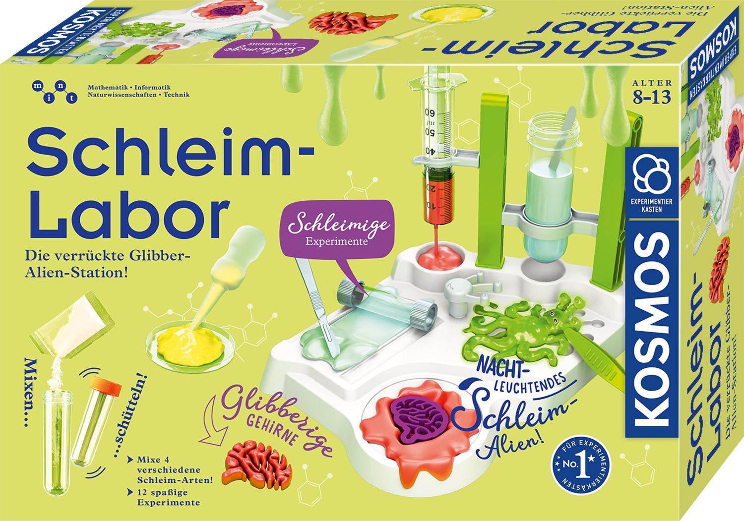 Nachtleuchtendes Schleim-Alien, Farbwechsel-Schleim, glibberige Gehirne einfach selber machen – Schleim in allen Formen und Farben gibt es im Experimentierkasten „Schleim-Labor“ von KOSMOS. An der Station aus robustem Kunststoff führen Kinder von 8 bis 13 Jahren tolle Experimente mit Pipette, Petrischale, Messbecher, Reagenzglas und Co. durch. Anrühren, ausrollen, ausstechen, durch eine Spritze drücken – mit diesem ganz besonderen Glibber-Material wird Laborarbeit zum großen Spaß und ganz nebenbei lernen die Kinder den richtigen Umgang mit ihren ersten Labor-Utensilien kennen.\n\nAusführliche Info-Texte erklären erste chemische Grundbegriffe, und die Anleitung beschreibt die einzelnen Schritte der Experimente anhand einer spannenden Alien-Forschungsmission. Übrigens: Der Experimentierkasten „Schleim-Labor“ ist mit der großen „Big Fun Chemistry“-Station von KOSMOS kombinierbar. Los geht’s mit den schleimigen Experimenten!\n\nInhalt: Verschiedene Schleimsorten, Ausstecher, Tubes, Alien-Stempel, Schleim-Station, Glitzerpulver, Wackelaugen, Skalpell, Pinzette, Pipette, Spritze, Sticker-Bogen\n\nZusätzlich wird benötigt: Wasser, Schere, Schnur, Uhr oder Timer, Taschenlampe