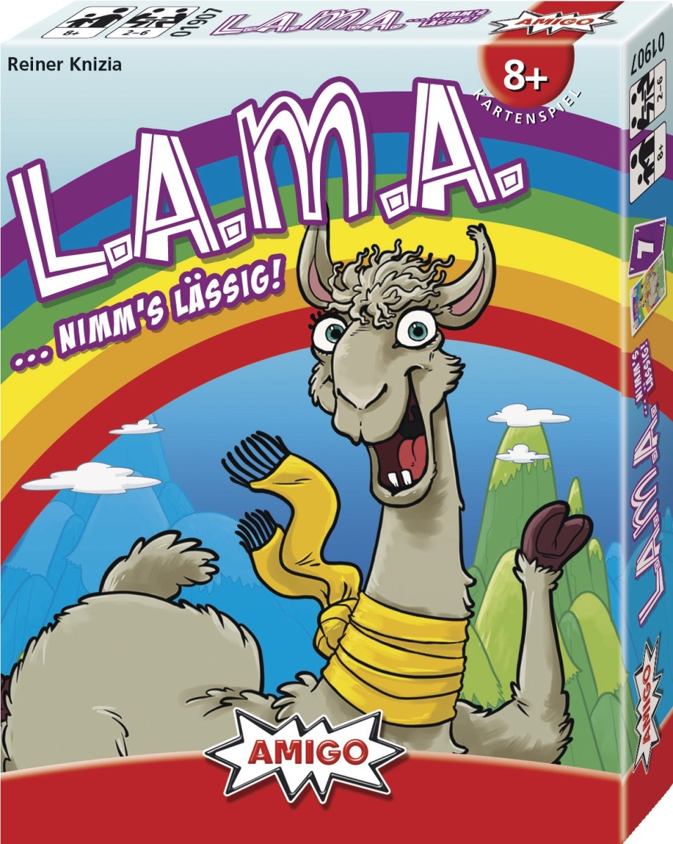 Der Name ist Programm, denn jedes Lama kennt die wichtigste aller Regeln: Lege Alle Minuspunkte Ab! Werde deine Karten los, um so möglichst keine Chips zu kassieren. Steigst du aus, oder hoffst du eine passende Karte zu ziehen? Entscheide dich! Am Ende gewinnt derjenige, der am lässigsten den Minuspunkten ausweichen konnte. Ein lässiges Kartenspiel mit Ärgerfaktor. Für 2-6 Spieler. Ab 8 Jahren. Spieldauer: ca. 20 Minuten.