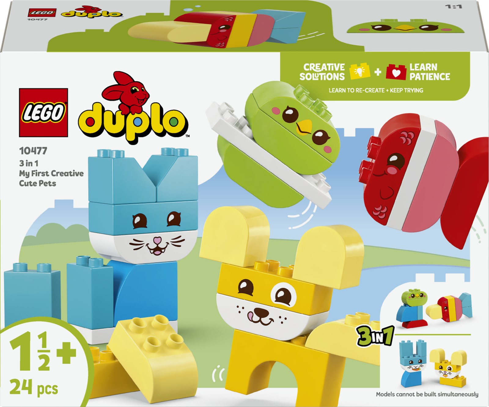 LEGO® DUPLO® 3-in-1 Kreative Tiere (10477) bietet kreativen Spielspaß mit farbenfrohen Tierfiguren. Kleinkinder ab 18 Monaten können 8 verschiedene niedliche Spielzeugtiere mit denselben Bausteinen erschaffen.\nDie 24 gut greifbaren Bausteine wurden speziell für die kleinsten Kinder entwickelt. Kleine Baufans können diese Teile benutzen, um einen Hund, eine Katze, Vögel, einen Hasen, eine Maus und Fische zu bauen. Einige dieser Spielzeugtiere für junge Kinder werden mit einfarbigen LEGO DUPLO Bausteinen dargestellt. Kleine Baufans lernen das Sortieren nach Farben, um ihr Tier zu erschaffen. Wenn sie der Figur dann noch ein freundliches Gesicht aufstecken, ist ihr niedliches Tier fertig.\nDieses kleine Geschenk lässt Kleinkinder Konzentration und Beharrlichkeit entwickeln, wenn sie verschiedene Bausteine ausprobieren, um die richtigen Teile für ihr Tier zu finden. Junge Kinder können aber auch kreativ werden und ein Fantasiewesen erschaffen, das sie sich selber ausdenken. Das Set besteht aus 24 Teilen.\n\n\nLernspielzeug für Kleinkinder: 3-in-1 Kreative Tiere (10477), bietet ein kreatives Spielerlebnis. Beim Bauen der verschiedenen LEGO® DUPLO® Spielzeugtiere lernen kleine Baufans unter anderem die Farben\nKREATIVE BAUOPTIONEN: Kleinkinder ab 18 Monaten üben ihre Fingerfertigkeit, wenn sie eine Katze, einen Hund, einen Hasen, eine Maus, 2 Vögel, 2 Fische oder ihr eigenes Fantasiewesen bauen\nEINFACH ZU BAUENDE FIGUREN: Jedes dieser Spielzeugtiere besteht aus großen, gut greifbaren und farblich zueinanderpassenden LEGO® DUPLO® Bausteinen. Die Gesichter sind deutlich dargestellt, um kleine Baufans ihr Lieblingstier erschaffen zu lassen\nLERNAKTIVITÄTEN FÜR KLEINKINDER: Dieses Spielset lässt junge Kinder Beharrlichkeit entwickeln, wenn sie verschiedene Bausteinkombinationen ausprobieren, um das perfekte Tier zu bauen. Beim Suchen der passenden Teile lernen sie außerdem die Farben\nGESCHENKIDEE: Das vielseitige LEGO® DUPLO® Bauset ist ein tolles kleines Geburtstagsgeschenk für Kinder ab 18 Monaten und für sehr junge Fans von Spielzeugtieren\nSICHERES SPIELERLEBNIS: Die Bausteine und Teile aus diesem kreativen LEGO® DUPLO® Set wurden gründlich getestet, um die höchsten globalen Sicherheitsstandards zu erfüllen\nLERN- UND SPIELSETS: Kreative LEGO® DUPLO® Spielsets helfen Vorschulkindern, ihre kleine Welt besser zu verstehen, wenn sie mit ihren Eltern oder Betreuungskräften bauen und spielen\nABMESSUNGEN: Der baubare Hund aus diesem 24-teiligen Set für sehr junge Kinder ist 11 cm groß