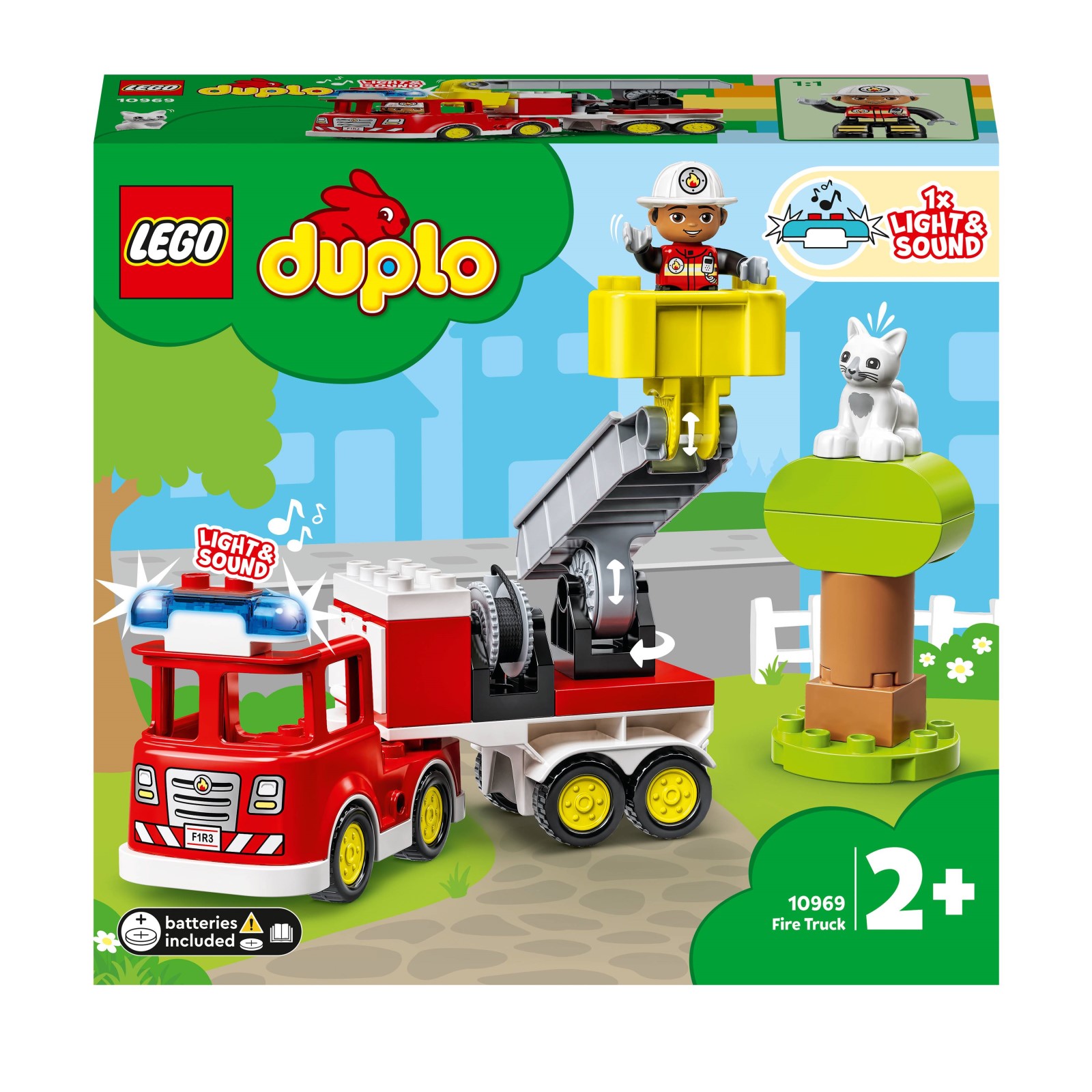 Das LEGO® DUPLO® Feuerwehrauto (10969) fasziniert Kinder ab 2 Jahren, die sich für Löschautos interessieren.Tierrettungen mit dem Feuerwehrauto Eine Katze sitzt hoch oben auf dem Baum und traut sich nicht mehr herunter! Mit blinkendem Blaulicht und schrillendem Martinshorn (Batterien liegen bei) kommt das Feuerwehrauto zu Hilfe. Dein Kind kann die Kurbel drehen, um die Leiter hochzufahren, und die Leiter dann mit dem Korb schwenken. Sollte das arme Kätzchen sich nicht von der Stelle rühren, lässt es sich vielleicht mit Leckerli runterlocken. Als letztes Mittel bleibt dann nur noch der Löschschlauch! Dieses Spielset lässt Vorschulkinder soziale, emotionale und feinmotorische Fähigkeiten entwickeln, wenn sie in die Rolle des freundlichen Feuerwehrmanns schlüpfen und das Feuerwehrauto mit den tollen Funktionen benutzen, um das niedliche Kätzchen vom Baum retten.Spielerischer Lernspaß für Kleinkinder Wenn junge Kinder mit den LEGO DUPLO Spielzeugen kreativ spielen und die Welt erkunden, können Eltern wichtige Entwicklungsschritte miterleben.Feuerwehrauto mit vielen Funktionen: Das LEGO® DUPLO® Feuerwehrauto (10969) weckt die Fantasie junger Nachwuchsfeuerwehrleute und lässt sie wichtige Fähigkeiten entwickelnAuthentische Details: Das Set beinhaltet zwei LEGO® DUPLO® Figuren – einen Feuerwehrmann und eine Katze – sowie einen baubaren Baum und ein vielseitiges Feuerwehrauto mit blinkendem Blaulicht und schrillendem Martinshorn (Batterien liegen bei)Entwicklungsfördernde Rollenspiele: Beim Darstellen fantasievoller Rettungseinsätze mit dem Feuerwehrauto verbessert dein Kind seine Fingerfertigkeit und entwickelt soziales und emotionales BewusstseinTolles Geschenk für Kinder ab 2 Jahren: Jedes Kind liebt Feuerwehrautos! Deshalb ist dieses Bau- und Spielset das ideale Geschenk für ein Vorschulkind, das coole Fahrzeuge und putzige Tiere liebtRiesenspaß für kleine Feuerwehrleute: Das Feuerwehrauto ist 17 cm hoch, 28 cm lang und 17 cm breit und lässt sich für weitere Abenteuer mit anderen LEGO® DUPLO® Spielzeugen kombinierenStory Starters: Eine spannende Bildergeschichte zu diesem Spielset lässt junge Kinder kreativ bauen und fantasievoll spielenSpielerisches Lernen: Alle LEGO® DUPLO® Sets sind mit verschiedensten Figuren und faszinierenden Details so konzipiert, dass dein Kind spannende Geschichten darstellen kann und einen LEICHTEN Start ins Leben hatTolle Qualität: LEGO® DUPLO® Elemente erfüllen bereits seit 1969 strenge Branchenstandards, damit kleine Finger die Teile leicht greifen, platzieren und wieder trennen könnenSicherheit hat Vorrang: LEGO® Steine und Teile werden Fall-, Hitze-, Druck- und Torsionstests unterzogen und analysiert, damit sie strikten globalen Sicherheitsstandards entsprechen