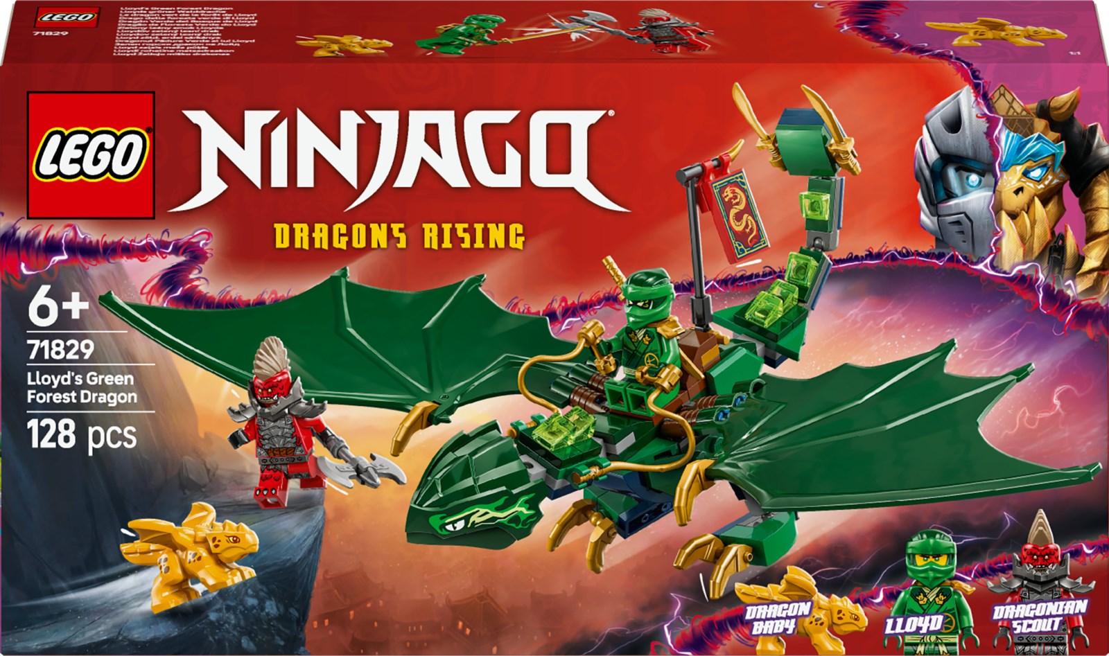 Lloyds grüner Walddrache (71829) ist ein Bau- und Spielset, mit dem Jungen und Mädchen ab 6 Jahren packende Actionszenen in der Luft aus der 3. Staffel der TV-Serie NINJAGO® Aufstieg der Drachen nachstellen können. Das Set beinhaltet einen imposanten Spielzeugdrachen, der Schwanz, Hals, Beine, Flügel und Hände bewegen kann. Der Drache trägt einen Sattel auf dem Rücken, damit eine Minifigur auf ihm reiten kann.Dieses LEGO® NINJAGO Drachenset beinhaltet auch 2 Minifiguren: Lloyd trägt ein goldenes Katana, und der böse Drachenspäher schwingt eine Axt. Und das Modell des goldenen Drachenbabys lässt Kinder so tun, als würden sie ein Tier umsorgen.Das LEGO NINJAGO Sortiment an baubaren Ninja-Spielzeugen umfasst Mechs, Flitzer und Tempel, die Kinder zusammen mit ihren Ninja-Helden in eine Fantasy-Abenteuerwelt eintauchen lassen. Jedes dieser Actionspielsets kann auch mithilfe der LEGO Builder App gebaut werden, die dich und dein Kind auf ein ebenso einfaches wie intuitives Bauabenteuer mitnimmt.Spielzeug-Drache für Kinder: Lloyds grüner Walddrache lässt Jungen und Mädchen ab 6 Jahren packende Actionszenen in der Luft aus der 3. Staffel der TV-Serie NINJAGO® Aufstieg der Drachen nachstellenBeweglicher NINJAGO® Drache: Lloyds grüner Walddrache ist ein baubares Modell, das Schwanz, Hals, Beine, Hände und Flügel bewegen kann. Der Drache trägt einen Sattel auf dem Rücken, damit eine Minifigur auf ihm reiten kann2 Minifiguren: Lloyd trägt ein goldenes Katana, und der böse Drachenspäher schwingt eine Axt, damit Kinder packende Actionduelle austragen könnenModell eines Babydrachen: Das goldene Drachenbaby aus diesem Bauset eröffnet völlig neue Spielmöglichkeiten und lässt Ninja-Fans so tun, als würden sie ein Baby umsorgenNinja-Geschenk: Dieses Actionspielset bietet ein faszinierendes Bau- und Spielerlebnis und ist eine tolle Geschenkidee für Kinder, die gern Ninja-Actiongeschichten darstellenGrößere Ninja-Abenteuer: Schau dir noch weitere separat erhältliche NINJAGO® Spielsets mit Tempeln, Mechs und Fahrzeugen anNinja-Spielzeuge in Hülle und Fülle: LEGO® NINJAGO® Sets lassen Kinder mit ihren Ninja-Helden in eine Fantasy-Abenteuerwelt eintauchenAbmessungen: Der bewegliche Drache aus diesem 128-teiligen LEGO® Bauset ist 10 cm groß, 24 cm lang und 33 cm breit