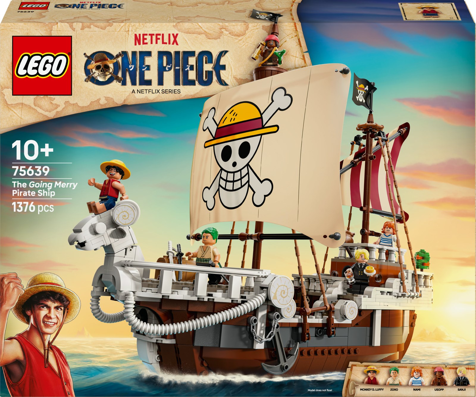 Das Piratenschiff Flying Lamb (75639) ist ein wunderschönes Modell, das die Fans von ONE PIECE Abenteuern und Bauspielzeugen zum Ausstellen begeistern wird. Dieses hochwertige LEGO® Bauset ist ein tolles Geschenk für Jungen und Mädchen ab 10 Jahren und für kreative Kinder mit einer Schwäche für die Strohhutpiraten.In dem Schiff sind mehrere Räume untergebracht: eine Kabine für die Crew, eine Kombüse, ein Lagerraum und eine Werkstatt. Zu dem Modell gehören auch 5 LEGO ONE PIECE Minifiguren. Ruffy sitzt über einer Kanone auf der Schaf-Galionsfigur am Bug. Zorro relaxt und trainiert auf dem Deck. Nami steht am Steuer am Heck, wo ihre geliebten Mandarinenbäume auf dem Deck wachsen. Lysop klettert die Masten hinauf und hält im Ausguck Ausschau nach anderen Schiffen. Und Sanji trägt Töpfe in die Kombüse hinunter. Auch 4 Steckbriefe liegen bei. In der LEGO Builder App können Kinder 3D-Ansichten der Modelle vergrößern und drehen und ihren Baufortschritt verfolgen. Das Set besteht aus 1.376 Teilen.Spielzeug-Piratenschiff für Kinder: Das Piratenschiff Flying Lamb aus diesem Set zum Spielen und Ausstellen ist ein tolles LEGO® ONE PIECE Geschenk für Jungen und Mädchen ab 10 Jahren, die die Netflix-Anime-Serie ONE PIECE liebenLEGO® ONE PIECE Minifiguren: Das Set beinhaltet die detailgetreu nachgebildeten Minifiguren Monkey D. Ruffy, Zorro, Nami, Lysop und SanjiLEGO® Set für junge Piraten: Das große Segelschiff hat Masten, Segel, eine Galionsfigur und ein Ruder. Unter Deck befinden sich die Kabine der Crew, eine Kombüse, Speisen, ein Steckbrief-Lager und eine WerkstattDetailgetreues Spielzeug-Piratenschiff: Ruffy kann sich auf die Schaf-Galionsfigur am Bug setzen. Unter seinem Lieblingsplatz befindet sich eine Shooter-Kanone, um Gegner zu verscheuchenPiratenschiff für viele Abenteuer: Dieses LEGO® ONE PIECE Set zum Bauen, Spielen und Ausstellen ist ein tolles Geschenk für alle Kinder, die Piratenschiffe und die Anime-Serie ONE PIECE auf Netflix lieben3D-Bauanleitung: Für ein fesselndes Bauerlebnis können sich Kinder die LEGO® Builder App herunterladen. Mit den digitalen Funktionen kann man 3D-Modellansichten vergrößern und drehen, Sets speichern und den Baufortschritt verfolgenLEGO® ONE PIECE Sammlerstücke: LEGO ONE PIECE Spielzeuge bieten jungen Fans die Möglichkeit, die Charaktere, Schauplätze und Abenteuer aus der Netflix-Serie mit den eigenen Händen nachzubilden1.376-teiliges Bauset: Das Schiff Flying Lamb ist 34 cm hoch, 39 cm lang und 20 cm breit