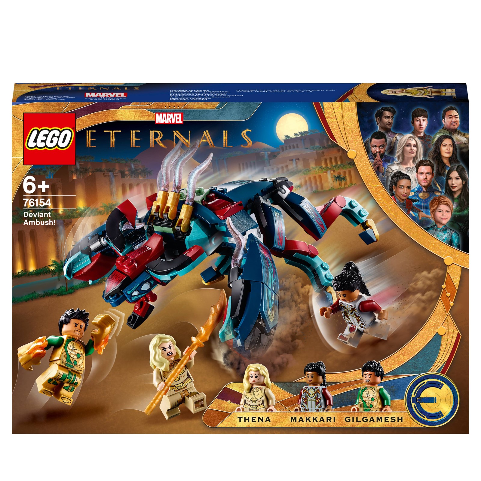 Mit dem LEGO® Marvel Spielset „Hinterhalt des Deviants!“ (76154) können Kinder die Action und den Nervenkitzel des Films „The Eternals“ aus den Marvel Studios nachstellen und sich eigene Superhelden-Abenteuer ausdenken. Jede Menge Actionspaß genau wie im Blockbuster auf der großen Leinwand! Wenn der 6-beinige Deviant Thena, Gilgamesh und Makkari mit seinem Schnappmaul angreift, müssen die Kinder den 3 Eternals mit allen ihren Superheldenkräften zur Seite stehen. Kinder können so tun, als würden sie die Superkräfte der 3 Superhelden-Minifiguren benutzen: Thenas Fähigkeit, Ausrüstung für den Nahkampf herbeizubeschwören, Gilgameshs Superstärke und Makkaris phänomenale Geschwindigkeit. Dieses Spielset ist das ideale Geschenk für einen Fan der Minifiguren. Als Minifigur ist Gilgamesh nur in diesem LEGO Spielset zu finden!Spielsets zum Film „The Eternals“ aus den Marvel Studios bieten endlosen Spielspaß LEGO Marvel Bauspielzeuge zum Film „The Eternals“ sind einzigartige Spielsets mit coolen Figuren, die Kinder zu unzähligen fantasievollen Rollenspielen inspirieren.Das LEGO® Marvel Spielset „Hinterhalt des Deviants!“ (76154) lässt kleine Superhelden die Action-Abenteuer aus dem Marvel Film mit den eigenen Händen nachstellen, wenn sie den 3 Eternals gegen den bösen Deviant beistehen.Beinhaltet 3 LEGO® Marvel Eternals: die Superhelden-Minifiguren Thena, Makkari und – exklusiv nur in diesem Set – Gilgamesh. Ein beweglicher 6-beiniger Deviant mit Schnappmaul sowie ein Dolch, eine Faustwaffe und ein Shooter sind ebenfalls enthalten.Kinder müssen all ihre Superheldenkräfte aufbringen, wenn der böse 6-beinige Deviant die 3 wichtigen Eternals angreift. Dieses fantastische Spielset ermöglicht unzählige fantasievolle Rollenspiele, in denen das Gute gegen das Böse bestehen muss.Du möchtest ein begehrtes Superhelden-Spielzeug verschenken? Dieses LEGO® Marvel Spielset zum Film „The Eternals“ mit Filmhelden-Minifiguren sowie einem beweglichen Deviant ist ein tolles Geburtstagsgeschenk für Kinder ab 6 Jahren.Der Deviant ist 12 cm groß und zieht im Kinderzimmer alle Blicke auf sich. Das LEGO® Marvel Set „Hinterhalt des Deviants!“ zum Film „The Eternals“ bietet megastarke Superhelden-Action.Das Superhelden-Spielset zum Film „The Eternals“ lässt Kinder bauen, spielen und kreativ werden. Und dank der einfachen beiliegenden Bauanleitung kann der Spaß sofort beginnen!LEGO® Marvel Spielzeuge zum Film „The Eternals“ lassen Kinder Abenteuer und Kino-Action mit den eigenen Händen darstellen! Die coolen Minifiguren zum Sammeln ermöglichen unzählige fantasievolle Rollenspiele und Abenteuer.LEGO® Bauspielzeuge erfüllen strenge Branchenstandards, damit sie einheitlich und kompatibel sind und sich jedes Mal mühelos zusammenstecken und wieder zerlegen lassen – und das schon seit 1958.LEGO® Steine und Teile werden Fall-, Hitze-, Druck- und Torsionstests unterzogen und analysiert, damit dieses Bauspielzeug für Kinder strikten Sicherheits- und Qualitätsstandards entspricht.