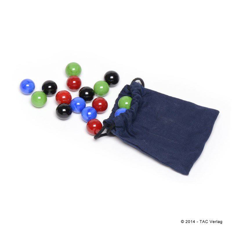 Beinhaltet 16 Glasmurmeln mit 16mm Durchmesser – jeweils 4 Stück handsortierte rote, grüne, blaue und schwarze Murmeln. Sie können das Set wahlweise mit oder ohne Säckchen bestellen.