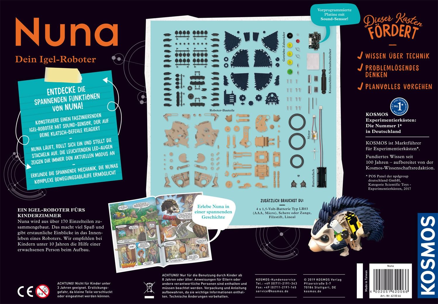 Ein schlauer Igel-Roboter, der auf Klatschbefehle reagiert – das ist Nuna aus der Roboterfamilie von KOSMOS. Mit dem Experimentierkasten konstruieren Kinder ab 8 Jahren einen Roboter, der es in sich hat. Dank des Sound-Sensors weiß der Igel genau, welche Bewegungen er ausführen soll. Er läuft, stellt die Stacheln auf und rollt sogar rückwärts! Die leuchtenden LED-Augen verraten, in welchem Modus sich der Igel-Roboter gerade befindet. Stecken, klicken, schrauben – das Zusammenfügen der 170 Einzelteile aus dem hochwertigen Bausatz fördert die Feinmotorik und planvolles Vorgehen und bietet viel Bauspaß. Die Anleitung zeigt detailliert und Schritt für Schritt, wie es geht. Mit einer Comic-Geschichte tauchen die Kinder in die Welt von Nuna, Izzy und Tom ein und erfahren spannendes rund um Roboter und ihre Mechanik.