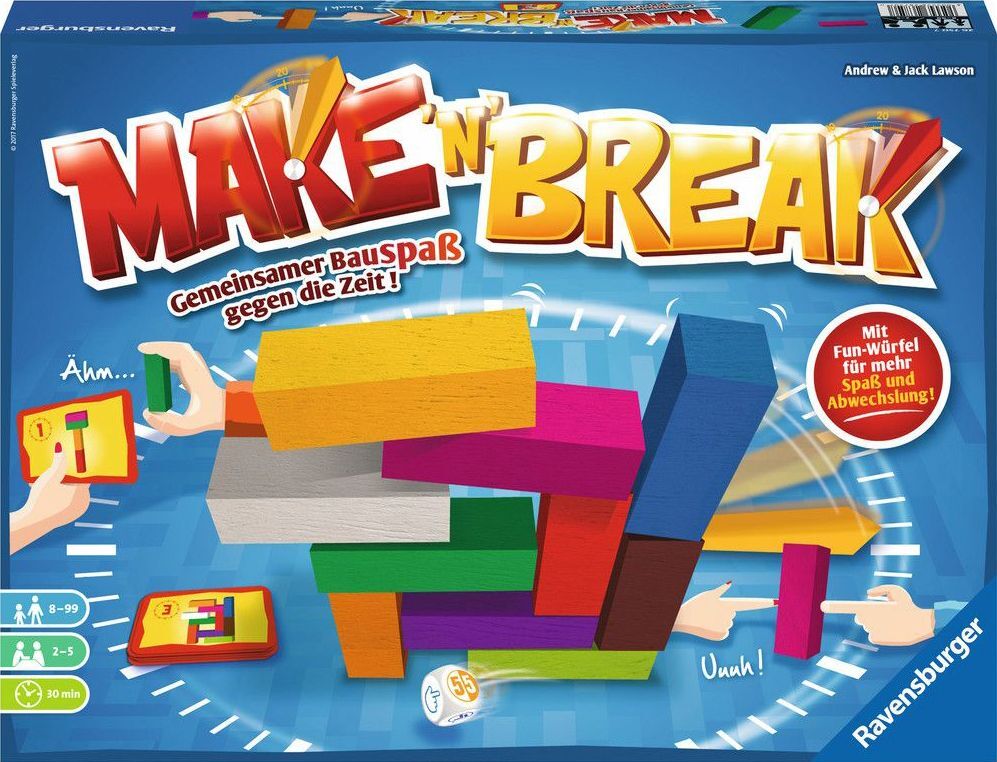 Gemeinsamer Bauspaß gegen die Zeit!Weitere ProduktinformationenDer Bauspiel-Klassiker – jetzt noch rasanter und kniffliger!Das Bauspiel des Jahrzehnts – jetzt komplett neu! „Make ’n’ Break“ hat eine riesige Fanbase, die sich jetzt auf eine neue Generation des turboschnellen Actionspaßes in 3D freuen darf. Ab jetzt wird gemeinsam gebaut und gepunktet. Aber gewinnen kann weiterhin nur einer!„Make ’n’ Break“ ist die spannende Herausforderung für große und kleine Baumeister. Denn nur, wer gemeinsam schnell bauen kann, gewinnt auch. Und bis dahin kann allerhand passieren! Während gemeinsam Stein auf Stein gesetzt wird, tickt unüberhörbar der Timer und gibt den rasanten Takt vor, dem sich auch die flinksten Mitspieler nicht entziehen können. Kombinationsgabe und Fingerfertigkeit entscheiden, ob die auf den 80 doppelseitigen Baukarten gestellten Vorgaben unter Zeitdruck erfüllt werden können. Die neuen 160 Aufgaben haben es wirklich in sich und zeigen, dass es im neuen „Make ’n’ Break“ sogar noch einen Tick ausgetüftelter und aberwitziger zugeht als zuvor. Vor allem durch den neuen Fun-Würfel mit seinen knifflig-pfiffigen Bauvarianten wird das Bauen noch abwechslungsreicher und verzwickter! Wer möchte, kann das neue „Make ’n’ Break“ aber zwischendurch auch gern mal wieder in der klassischen Variante spielen.Die kleinen und großen Baumeister lernen bei diesem Spiel, mit Tempo umzugehen, blitzschnell Entscheidungen zu treffen und ihre Teamfähigkeit unter Beweis zu stellen. Wer beim Ticken des Timers die Nerven behält und fröhlich seine farbigen Steine positioniert, den wird auch im Alltag so schnell wohl nichts umwerfen. Insofern ist „Make ’n’ Break“ nicht nur ein turbulenter Spielspaß für geschickte Fingerakrobaten – das Bauabenteuer trainiert auch wertvolle Fähigkeiten, die man überall gut gebrauchen kann!Im Zeitraffer zum König der Baumeister.Inhalt/Ausstattung1 Timer, 10 Bausteine aus Holz, 80 beidseitige Baukarten, 2 Würfel
