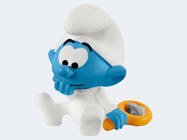 Der Schleich® Baby Schlumpf spielt am liebsten mit der gelben Rassel.