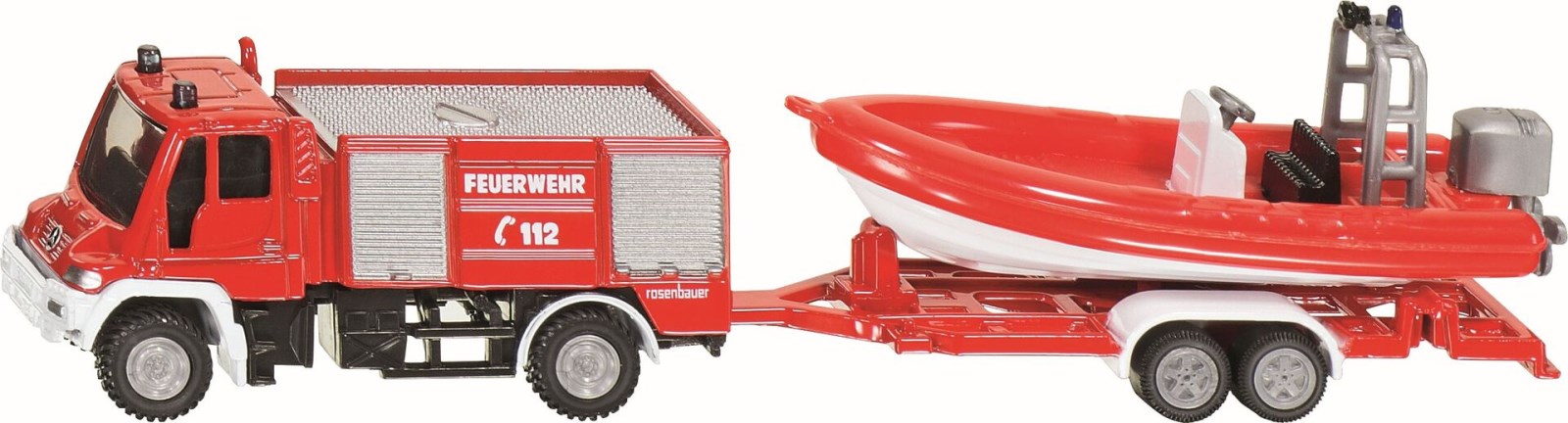Detailliertes Spielzeugmodell eines Feuerwehr Unimog mit Anhänger und Boot zum Spielen und Sammeln, Für kleine und große Feuerwehr-Fans - Robustes und stabiles Design dank Metallkarosserie, Sehr gute Rolleigenschaften durch Bereifung aus Gummi, Anhängerkupplung zur Kombination mit Anhängern im gleichen Maßstab, Schwimmfähiges Boot - Ideal als Geschenk für Kinder zu bspw. Geburtstagen oder für zwischendurch geeignet, aber auch als Dekoration für Erwachsenen-Geburtstage oder Hochzeitsgeschenke - Perfekt zum platzsparenden Mitnehmen, Langanhaltender Spielspaß durch unzählige Kombinationsmöglichkeiten innerhalb der SIKU Spielwelt - Lieferumfang: 1x SIKU 1636 Feuerwehr Unimog mit Anhänger und Boot, Material: Metall/Kunststoff, Abmessungen: 16,7 x 2,9 x 4,2 cm, Gewicht: 0,07 kg, Farbe: Rot