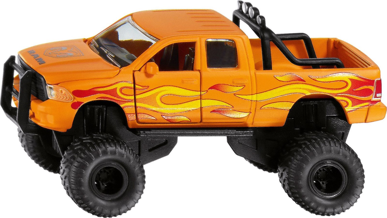 Detailliertes Spielzeugmodell eines höhergelegten Dodge RAM 1500 mit beidseitiger Flammenbedruckung zum Spielen und Sammeln, Für kleine und große Fans amerikanischer Fahrzeuge - Robustes und stabiles Design dank Metallkarosserie, Öffenbare Motorhaube, Türen und Heckklappe, Wechselbare Räder, Gummierte Ballonreifen, Einzeln gefederte Achsen, Detailgetreues Design - Ideal als Geschenk für Kinder zu bspw. Geburtstagen oder für zwischendurch geeignet, aber auch als Dekoration für Erwachsenen-Geburtstage oder Hochzeitsgeschenke - Perfekt zum platzsparenden Mitnehmen, Langanhaltender Spielspaß durch unzählige Kombinationsmöglichkeiten innerhalb der siku-Spielwelt - Lieferumfang: 1x siku 2358 RAM 1500 mit Ballonreifen, Material: Metall/Kunststoff, Maßstab: 1:50, Maße: 12 x 5,6 x 6,3 cm, Gewicht: 0,1557 kg, Farbe: Schwarz/Orange, Serie: SIKU SUPER