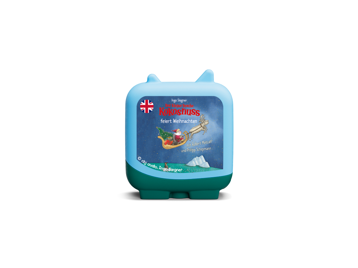 Hörfigur für die Toniebox:Tonies sind Hörfiguren für die Toniebox. Sie machen Hören anfassbar, denn mit ihnen bedient man die Toniebox. Man kann sie aber auch sammeln und mit ihnen spielen. Um der Musik zu lauschen, stellt man die Hörfigur einfach auf die Toniebox.Weihnachtsmann? Weihnachten? Davon haben Kokosnuss und Matilda noch nie gehört. Doch als das Yeminee mit leuchtenden Augen von Heiligabend erzählt, ist klar: Dieses Fest wollen die Drachen auch feiern! Gemeinsam mit ihrem britischen Freund Robert machen sie sich auf den Weg zum Weihnachtsmann. Auf dieser Reise lernen die Kinder nicht nur neue Englischvokabeln zu den Themen „Winter“, „Weihnachtsgeschichte“ und „Weihnachtsfest“, sondern auch was an Weihnachten eigentlich gefeiert wird und welche Weihnachtsbräuche es gibt. Basierend auf Ingo Siegners Buch Der kleine Drache Kokosnuss feiert Weihnachten vermitteln Native Speaker Robert Metcalf und Kokosnuss-Stimme Philipp Schepmann den jungen Zuhörern einen ersten Einstieg in die englische Sprache.