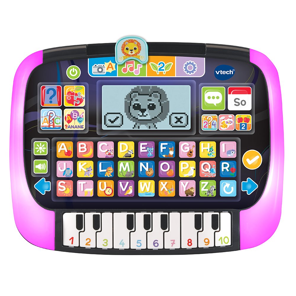 Mit dem Lern- und Musiktablet ist Lernspaß garantiert!- Sprechendes, musikalisches Tablet mit leuchtendem Rahmen, Buchstaben- und Zahlentasten sowie Klavierfunktion- 26 Buchstabentasten mit passenden Bildern- 10 Klaviertasten mit bunten Zahlen- Ein niedlicher Löwe führt spielerisch durch die Aktivitäten- Hintergrundbeleuchteter LCD-Bildschirm (4 Farben) mit Helligkeitsregler- Der Rahmen des Tablets leuchtet in 4 verschiedenen Farben passend zur jeweiligen Aktivität- 12 Spielaktivitäten zu den Themen Zahlen und Zählen, Größer und Kleiner, Buchstaben, Wörter bilden, Wochentage, lustiges Fragespiel mit dem Löwen, Klavier spielen (Aktivitäten auswählbar über Schieber und Aktivitätentasten)- Hintergrundmusik (insgesamt 10 Melodien) lässt sich ein- und ausschalten- Kindersicheres Batteriefach, Abschaltautomatik und Lautstärkeregler- Demobatterien sind enthalten