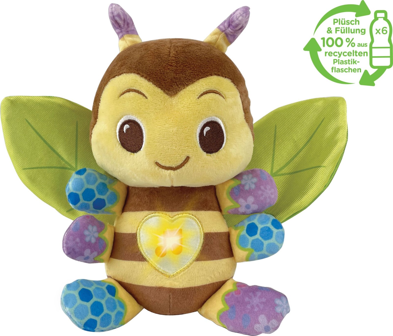 Summ, summ, summ, Bienchen summ herum!- Süße Plüschbiene zum Kuscheln und Liebhaben, die aus nachhaltigem Material hergestellt wird- 100 % recycelter Plüsch auf Basis recycelter Plastikflaschen hergestellt (6 Flaschen pro Biene), schont die fossilen Ressourcen der Erde- Flügel aus Knistermaterial fördern die sensorische Wahrnehmung- Die verschiedenen Stoffarten (Velour, Jersey, Satin) regen den Tastsinn an- Biene kann als Handpuppe verwendet werden: Die Hände können von hinten in die Flügel gesteckt werden, sodass die Biene mit den Flügeln schlägt- Die leuchtende Herztaste auf dem Bauch der Biene blinkt in zwei verschiedenen Farben und löst tolle Sätze, Geräusche und Musik aus- Die elektronische Einheit kann herausgenommen werden, sodass die Biene ganz einfach gewaschen werden kann (maschinenwaschbar)- 2 gesungene Lieder und 30 Kindermelodien- Lautstärkeregler, kindersicheres Batteriefach und Abschaltautomatik- Demobatterien enthalten