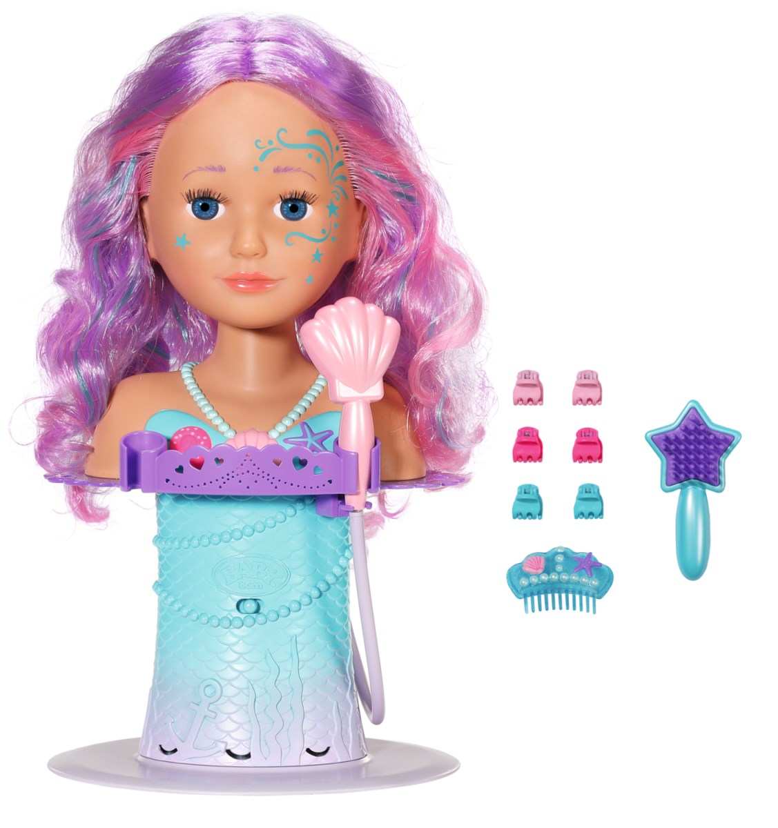 Hier wird die Badewanne zum Unterwasserwelt-Friseursalon. Der Stylingkopf im Meerjungfrau-Design ist der Frisiersalon für die Badewanne. Einfach dem Gummiboden in der Wanne befestigen, dann noch Wasser einlassen und schon kann der Hair-Stylisten-Nachwuchs loslegen. Das bunte Haar mit farbigen Strähnen ist qualitativ hochwertig und kann immer wieder zu neuen Frisuren gestylt werden. Die sechs Haarclips und der Diadem-Kamm verzieren die Haarpracht. Am Sockel des Kopfes befindet sich eine Ablagefläche für diese Haar-Accessoires, sowie Fixierungen für die Bürste in Seesternform und die Brause. Wird der muschelförmige Duschkopf aus der Halterung genommen, startet die Pumpe und das Wasser läuft – aber nur, wenn der Styling Head auch wirklich im Wasser steht. Der leicht drehbare Kopf ist mit zauberhaften Mustern bemalt. Zusätzlich kann er mit dem separat erhältlichem BABY born Sister Styling Make Up geschminkt werden. Waschen, Stylen, Frisieren und Schminken. Das abwechslungsreiche (Rollen-)Spiel fördert die Fantasie und unterstützt motorische Fähigkeiten. Für erweitertes und lang anhaltendes Spielvergnügen. Batterien erforderlich (nicht im Lieferumfang enthalten). BABY born Sister Styling Head Meerjungfrau mit elektronischer Brause. Inkl. Bürste, Diadem und 6 Haarclips.